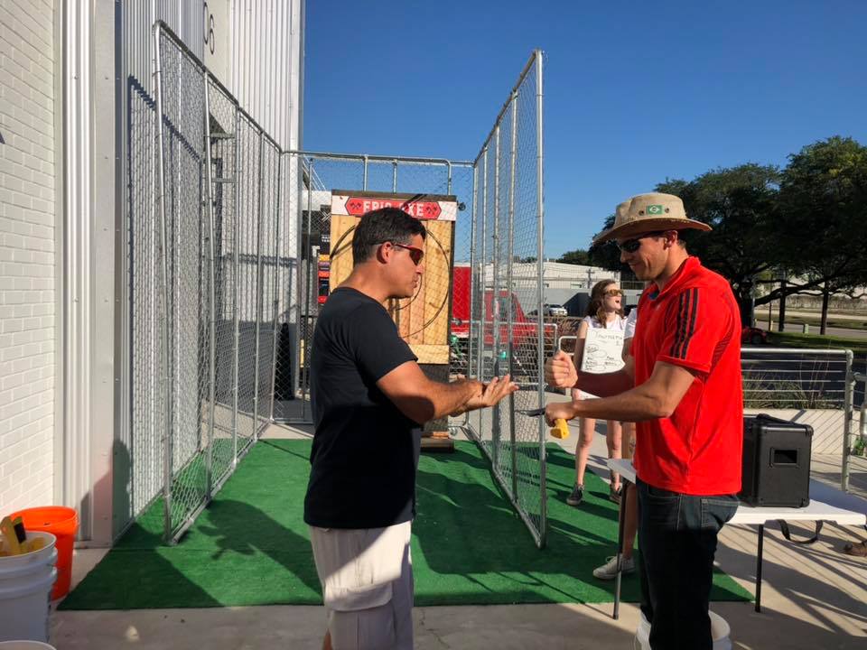 Catch a glimpse of how axe throwing can be a lot of fun. Take a look at our happy participants enjoying the sport. Make your events fun and exciting too. Get in touch with Mobile Axe Houston for mobile axe throwing entertainment services. Give us a call